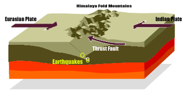 This collision is causing uplift that produces the highest mountain peaks in the world including the Himalayan, the Karakoram, the Pamir and the Hindu Kush ranges. As the Indian plate moves northward, it is being subducted or pushed beneath the Eurasian plate. Much of the compressional (squeezing together) motion between these two colliding plates has been and continues to be accommodated by slip on a suite of major thrust faults that are at the Earth’s surface in the foothills of the mountains and dip northward beneath the ranges.